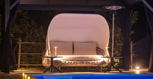 テラスにはガゼボーを始めとしたリラックスコンテンツを各種ご用意。 強い日差しや雨を気にせず“屋外で暮らす”体験を味わえるプールサイドリビングを設えました。 パラソルヒーターを完備しているため肌寒くなる夜でも暖をとりながらお過ごしいただけます。